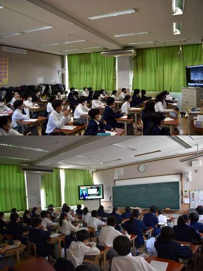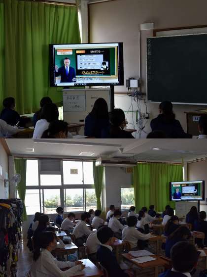 本来でしたら,KDDIより講師の方をお招きして講演形式で直接お話をしていただくのですが緊急事態宣言中であるため各教室でDVDをお借りして担任より指導をしました。