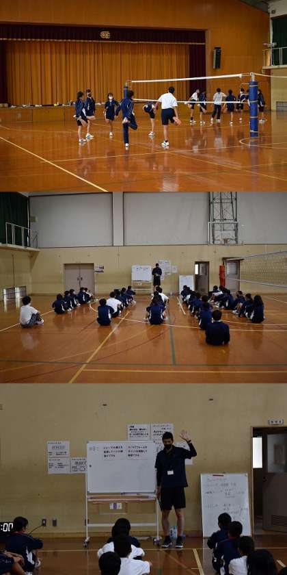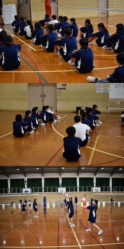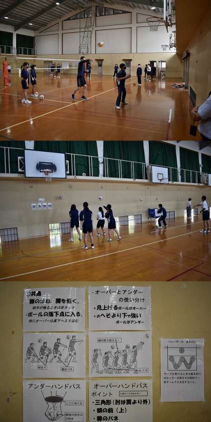 進んでいるクラスは,サーブ練習やスパイクを打つ時の手の使い方やミートする場所について説明を受け,練習をしました。ほとんどの生徒がバレーボールの経験がないということでしたが,塩田先生の指導で上達していくことでしょう。ゲームでラリーが続くように練習を重ねましょう。
