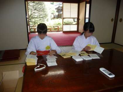 ここでは、女子生徒が巫女さんの衣装を着させていただいて、人形