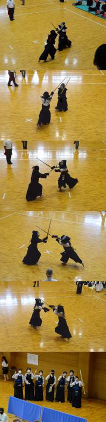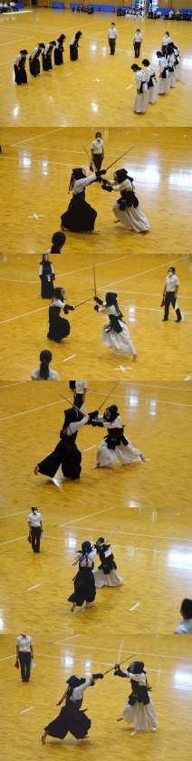 7月23日(金)京都市武道センターにて、京都市中学校選手権総合体育大会剣道団体戦が行われました。男子は惜しくも初戦で敗れてしまったものの,女子は着々と駒を進め,決勝で桂中学校と対戦しました。先鋒は接戦の末、桂中学校に2本先取されましたが、次鋒と中堅がしっかりと取り返し、勝数2対1(本数4対4)になりました。副将は粘ったものの2本とられてしまい、勝数2対2(本数4対6)になり大将戦の結果次第となる展開になりました。しかしながら、大将が小手を2本連続で取り、勝数3対2(本数6対6)で優勝することができました!