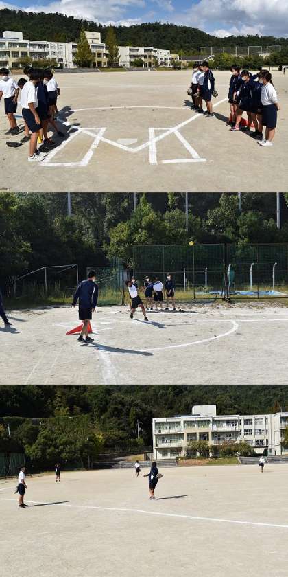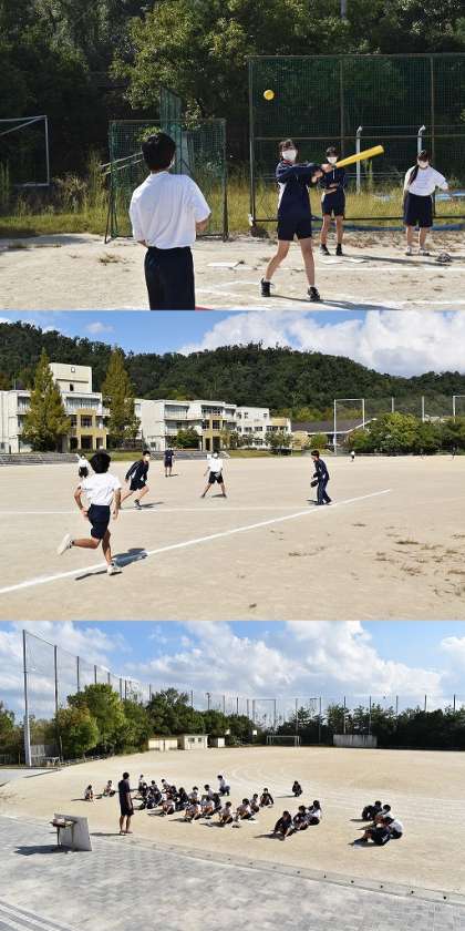 今日は,三角ベースでのゲーム形式でそれぞれのプレーについてどのような対処をすればよいのかを学びました。初めてバットを持つという生徒もいてボールを打つのが難しそうにしていましたが何回か打席に立つうちにあたり,前に飛ばすことができました。