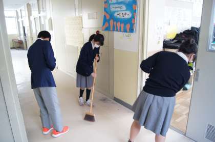2年生はいつもの掃除区域を念入りに、1年生は加えて校門周辺の落ち葉掃除にも取り組んでくれました。写真は1年生の活動の様子です。みんな心を込めて隅々まできれいにしてくれました!