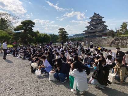 各グループは市内班別行動を終え、15:30に松本城に再集合しました。これからバスで宿泊先の白馬村へ向かいます。