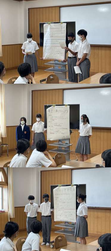 班ごとにスライドを用いて進捗状況を報告し、お互いに質問や意見交換を行ったうえで、模造紙に再度まとめ直すといった流れで行いましたが、どの班も指摘された意見をもとに、より深くより具体的な協議ができていました。