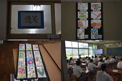 教室の前には美術の授業の「絵手紙」が飾られています。