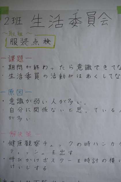 今日は,1班評議委員会「他学年と交流しよう」と2班生活委員会「服装点検について」のアイデアを紹介します。