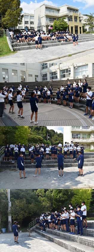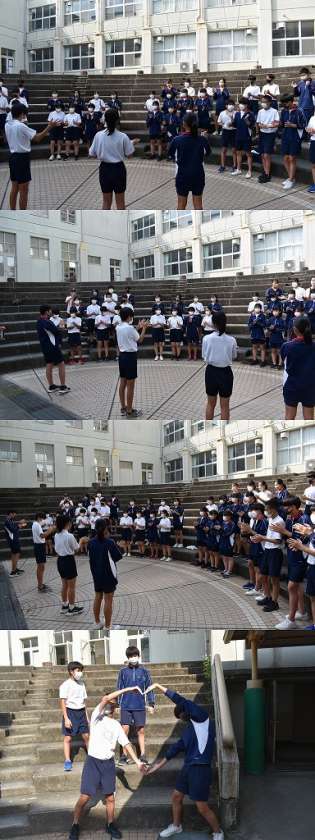 今日が初めての練習でなかなか最初は上手に進めることができませんでしたが,みんなの協力もありだんだんと手拍子をあわせたり,動きを確認することができました。大きな声を出すことができないので大変ですが,リーダーの生徒を中心に仕上げてください。