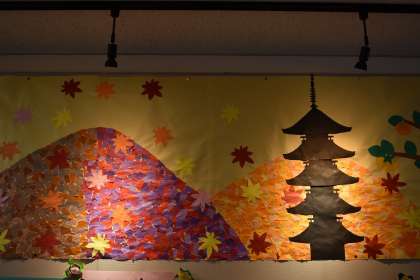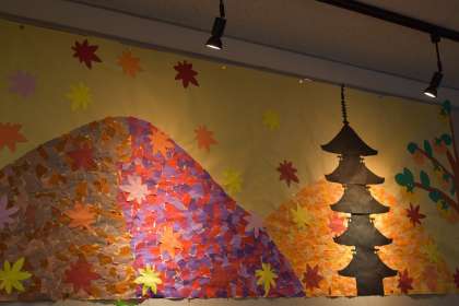 校務支援員の川中さんと伊澤さんが大枝ギャラリーの模様替えをしてくださいました。今月は、紅葉した山と大枝の柿を表現していただきました。前を通った時には、ゆっくり見て行ってください。