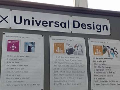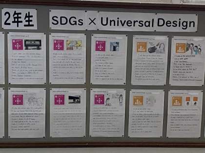 今回は身のまわりにあるユニバーサルデザインとSDGsとを関連させて、スピーチを行い、まとめたものが掲示されています。