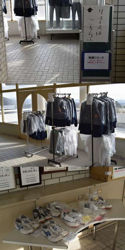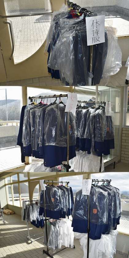 卒業生や在校生宅より提供していただいた制服、体操服、体育館シューズ等が展示されています。必要とされるご家庭は、ぜひお立ち寄りください。
