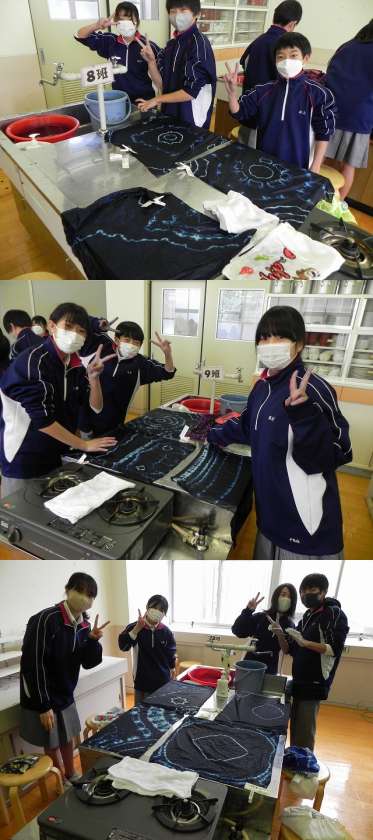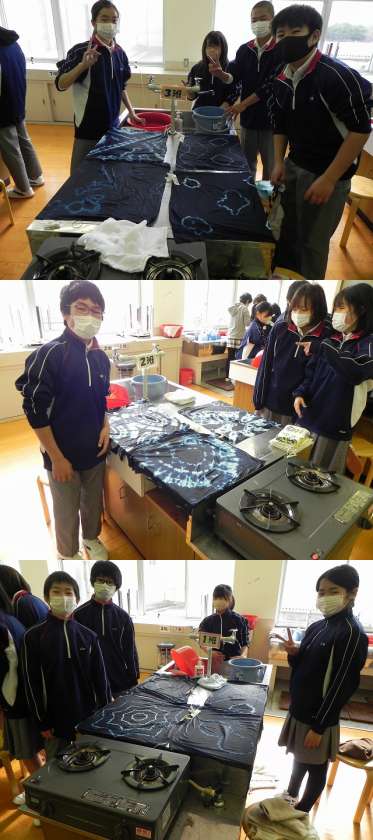 講師の武村葉子先生には、藍染についての講義、輪ゴムを使っての「絞り」の作業、そして今回の「染め」の作業と5つのクラスで各3回にわたってご指導をいただきました。おかげ様で素晴らしい作品ができあがっています。作品は次回の家庭科の時間で生徒の皆さんにお渡しすることになります。楽しみに待っていて下さいね。