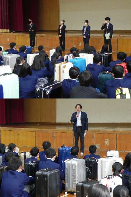 はじめにこれまで準備に頑張ってくれた修学旅行委員メンバーの紹介、続いて修学旅行委員長の挨拶、添乗員さん・写真屋さんのご紹介、最後に校長先生からのお話しがありました。出発式は順調に進行し、予定より早くバスへの移動となりました。