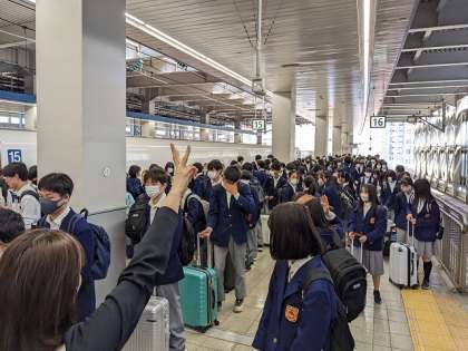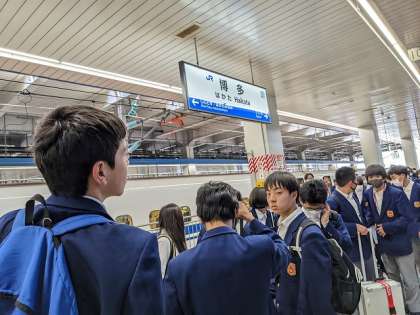 博多駅に到着しました。これからバス4台に分乗し、大刀洗平和記念館へ向かいます。