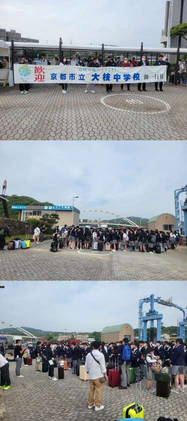 予定の16時55分頃、郷ノ浦湊(壱岐)に到着しました。「歓迎 大枝中学校」の横断幕に感激です。