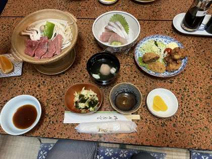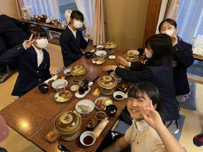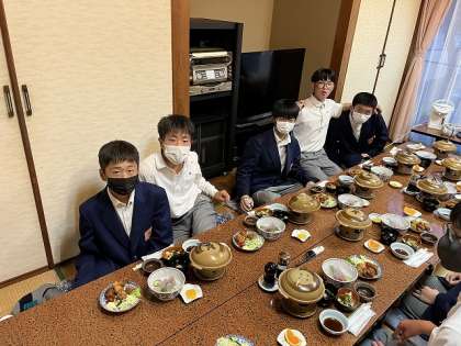 さつき荘の夕食の様子です!明日も元気よく修学旅行を楽しむために、味わいながらしっかり食べましょう!
