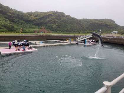 島内巡りチームはイルカパーク でイルカのトレーニングの様子を見学中です。寒いです。このあとエサやり体験ができるそうです。