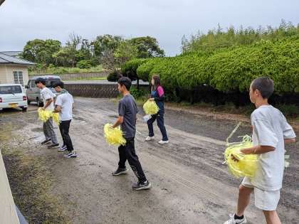 2日目の夕方、レクリエーション出し物の事前練習を雨の中、実施中!