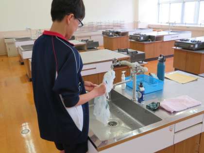 1組で藍染めのたたき染を行いました。これは染め終わって、きれいに洗い落としている様子です。うまく染まると、きれいな藍色が発色するそうです。