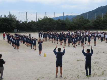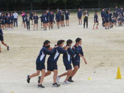 さすがに3年生は手慣れたもので「EXダンス」も上手にできていました。準備運動の後に本番と同じように校歌も斉唱しました。音楽がなかったせいか、少し歌いづらかったようです。そのあと、学年競技の「ムカデでGO!」の練習が行われました。4人1組になり、間にボールをはさみながら、ムカデのように走って、交代していく競技です。ボールを落とすと、その場所に戻りはさみ直してリスタートでした。本番までに落とさず早く走れるように練習を重ねてください。