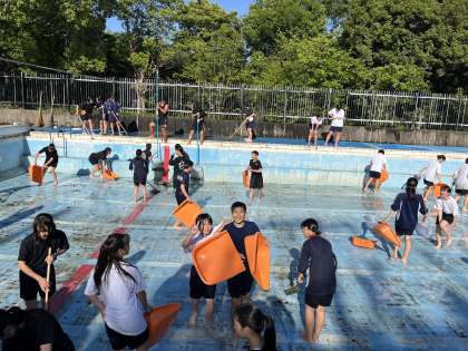 放課後にプール清掃を行いました。バスケットボール部、バレーボール部のみなさんで協力してきれいにしてくれました。ありがとうございます!プールの授業は来週から始まります。