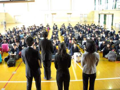 5月10日木曜日五月晴れの朝、体育館で修学旅行委員会主催の結団式が