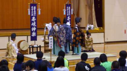 11日の夜、体育館に学年全体が集まって国の指定文化財の「壱岐神楽」
