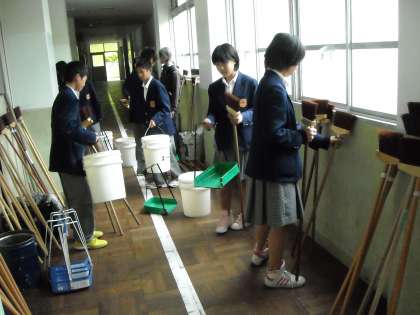 各クラスの美化委員は、自分の教室のほうき、ちりとり、ゴミ箱を持参し、