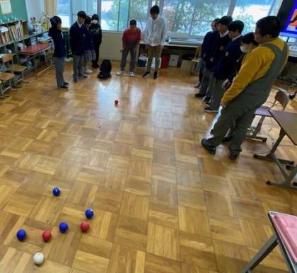 今日は西総合支援学校の高等部の生徒さんが3人来てくださって、中高交流会をしました。西総合のことをクイズなどを交えて紹介してもらった後、2チームに分かれてボッチャをしました。わずかな差で赤チームの勝ちでした。とても楽しかったです。ありがとうございました。