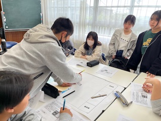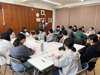 高知県立大学の防災プログラムを体験しました。講師の女性防災リーダーさんのもと学校が避難所になった時の避難所の運営について考えました。