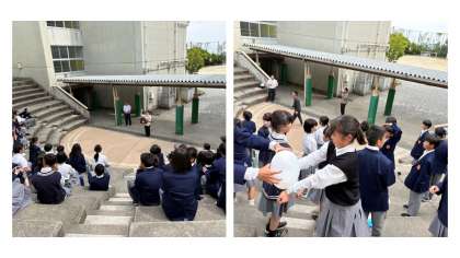 15日(木)の5限、1年生は、野外ステージにて学年集会を行いました。各クラスの月目標の発表、レクリエーション、音楽のリサイタルを行いました。評議員の司会のもと、とても盛り上がり、素敵な雰囲気に包まれました。