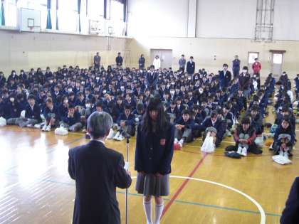 生徒指導部の先生から冬休みの生活についての話があり、全校集会は