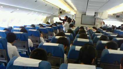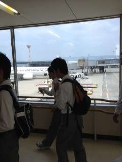 伊丹空港に無事到着!大きな荷物を機内に入れ,いよいよです!飛行機に乗ることが初めての人も多いかも? ドキドキ・ワクワクですね! 予定より少し遅れて沖縄に向けて出発しました!