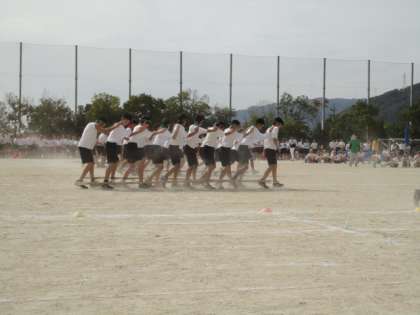競技は1年生男女による100m走に始まり、トラック競技、学年別レクレーション競技、団体種目などが、多数の保護者・地域の方々が見守る中、向う正面に並んだ色別応援団の熱い声援を受けながら、次々と競技が進められました。