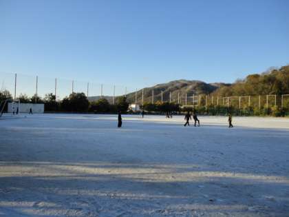 今朝はよく晴れていますが、気温が低くグラウンドや通学路に雪が残りました。
