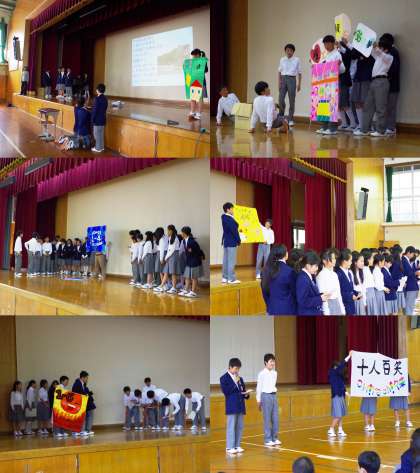 司会や運営も学級委員が中心となっておこなわれました。さすが中学生ですね。どのクラスも工夫が凝らされ、発表の仕方も歌あり、劇ありと手が込んでいます。ただ、1年生担当の先生からのご指摘にもありましたが、もう少し「準備」の時間が必要だったかもしれませんね。(写真:中)