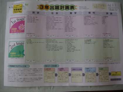 学習確認プログラムとは、中学校での学習内容を計画的に総復習し、その達成状況を定期的にテスト形式で確認します。写真下はその出題範囲表です。3年生諸君にはすでに配布済みですが、お部屋のどこかに掲示してあるでしょうか?