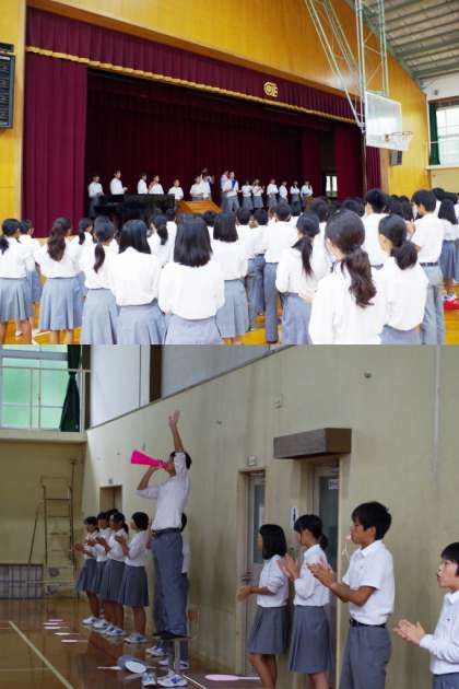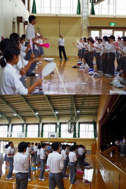 本日は体育館を覗いてきました。両サイドに陣取った桃組と青組が「熱く」練習をしていました。