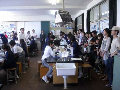 窓や扉を開放した教室の授業を廊下に並んで参観していただいたり盛況でした。