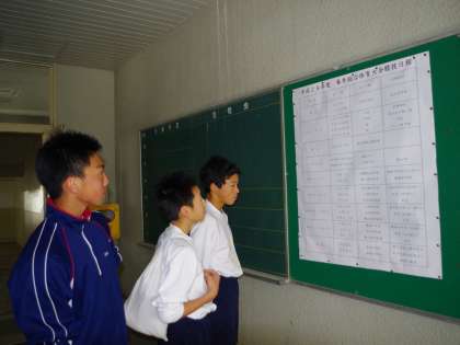 本校1階の渡り廊下に、春季総合体育大会の日程が掲示されています。男子生徒諸君が興味深そうに見ていたので、思わずシャッターを切りました。