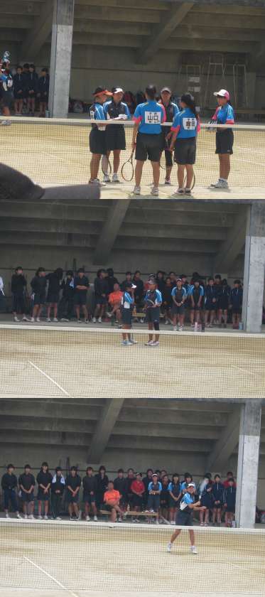 昨日5月1日(日)に加茂川中学校コートにおきまして,春季大会女子ソフトテニス団体戦の1回戦が行われました。夏日のような強い日差しの中,桃山中学校と対戦し熱戦を繰り広げました。残念ながら0−4で敗退しましたが,試合に出場した選手のみなさんは全力でプレーしました。また,応援で参加していた部員のみなさんは,声をからして最後まで懸命に声援を送り,決して諦めませんでした。