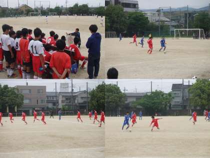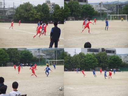 春季大会4回戦は桂中学校会場において樫原中学校と対戦し,4ー0(前半2ー0 後半2ー0)で勝利! ベスト8に進出ました。前半は一進一退の攻防が続き,チーム一丸となって我慢強く対応してチャンスを作り続けた結果,待望の先取点につながりました。さらに得点を加え,攻撃・守備ともによいリズムを保ち,後半も順調に得点を重ねることができました。ピンチの場面もありましたが,GKのスーパーセーブで切り抜けての3試合連続完封勝利は,明日の試合に向けておおいに弾みがつきました。
