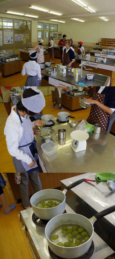 材料の梅は、本校の南A棟前にある梅の木から、生徒たちが一つずつ収穫したものです。力を合わせて手にしたかご一杯の梅を、砂糖を加えたお湯にいれていきます。甘酸っぱいさわやかな香りが部屋に満ちていきます。