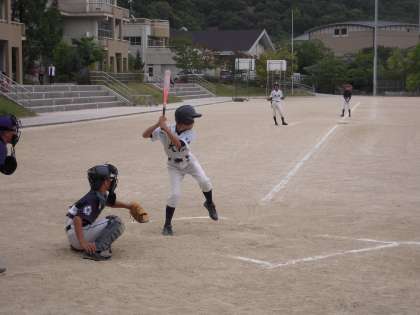 野球部は、勧修中学校と練習試合を行いました。試合開始で整列する勧修中学校の部員、試合の様子です。バッターは、スタメンに起用された一年生のFくんです。