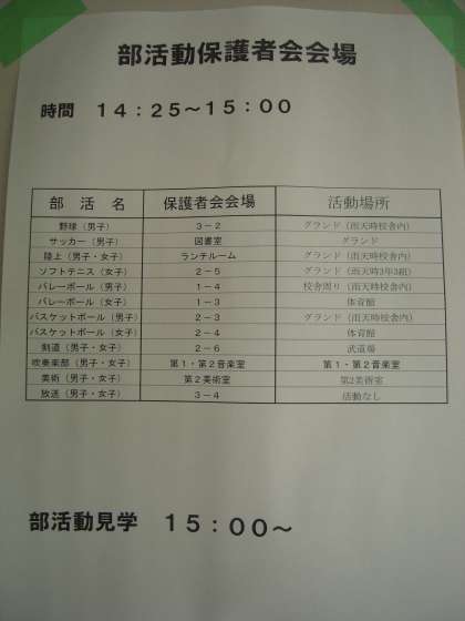 午後から行われる予定になっている「部活動保護者会」の会場を掲載させていただきます。14:25〜15:00を予定しております。終了後は、部活動見学ができます。