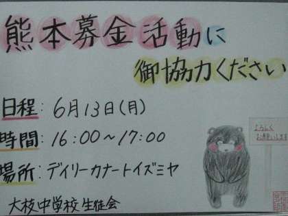 について考えてきました。その結果,地域の方々がたくさん集まる場所で,募金活動を行うことになりました。大枝中生徒会の募金活動に,何卒ご理解,ご協力をいただきますようよろしくお願いいたします。