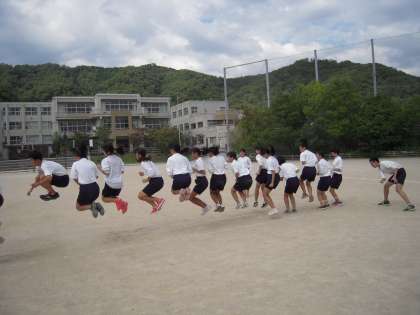 昨日の挑戦では2回に終わった3−4が、見事なクラスワークを発揮して14回の大幅な記録更新を達成しました。(写真上)、5限は猛暑の中でふらふらになりながらも、学年最高記録となる15回を出した3−3のメンバー達です。(写真中)、とっても仲が良い記録更新に燃える3−2の練習風景です。(写真下)どのクラスも、体は疲れていても、気持ちで負けないようにみんなで声をかけあい、励まし合っていました。
