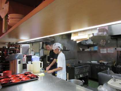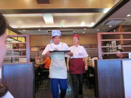 「得々うどん」・・・・緊張しながら注文の品を運んでくれています。お漬物など整理したりしています。最終日,自分のお昼を教えてもらいながら作らせてもらっています。