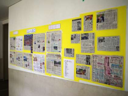 ご来校いただくとお気づきになるかと思いますが、廊下のあちこちに「新聞」の切り抜きが、その時々のテーマごとに掲示され、生徒諸君が見入っている姿もよく見受けられます。