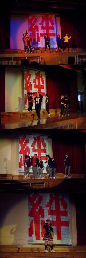 生徒会からは、「いじめ0」の取り組みとして、「絆(きずな)」をテーマに本校生徒全員が記入した「行動宣言」をつなぎあわせて大段幕を作成しました。すばらしい出来映えです。有志発表のバックに飾られています!