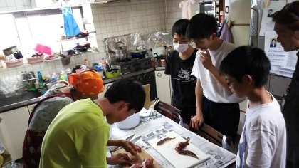 自分たちで獲った魚を戻ってさばきます。今夜のごはんが楽しみですね!!